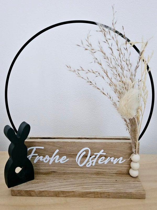 Unser Dekoaufsteller aus Holz mit einem eleganten schwarzen Metallring, getrockneten Blumen und bezaubernden Hasen aus Jesmonite ist das perfekte Statement für die festliche Jahreszeit. Verleihe deinem Zuhause einen Hauch von Frühling und Frohsinn mit diesem exquisiten Oster-Dekoensemble.